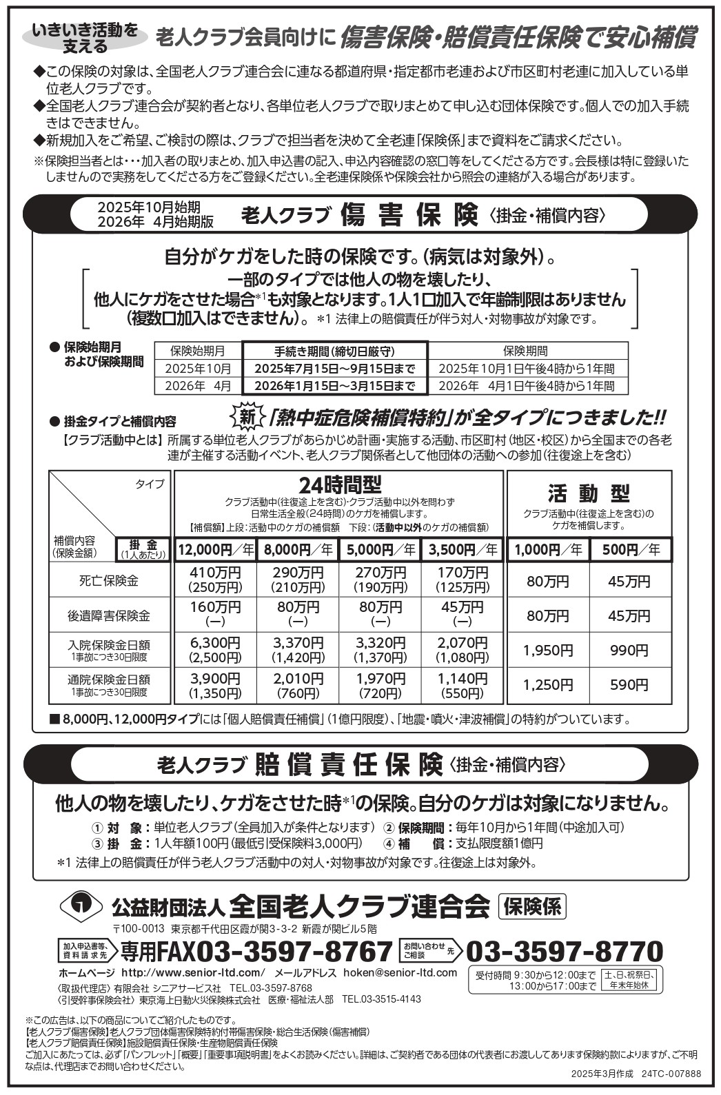 詳しくは『全国老人クラブ連合会 保険係』へ